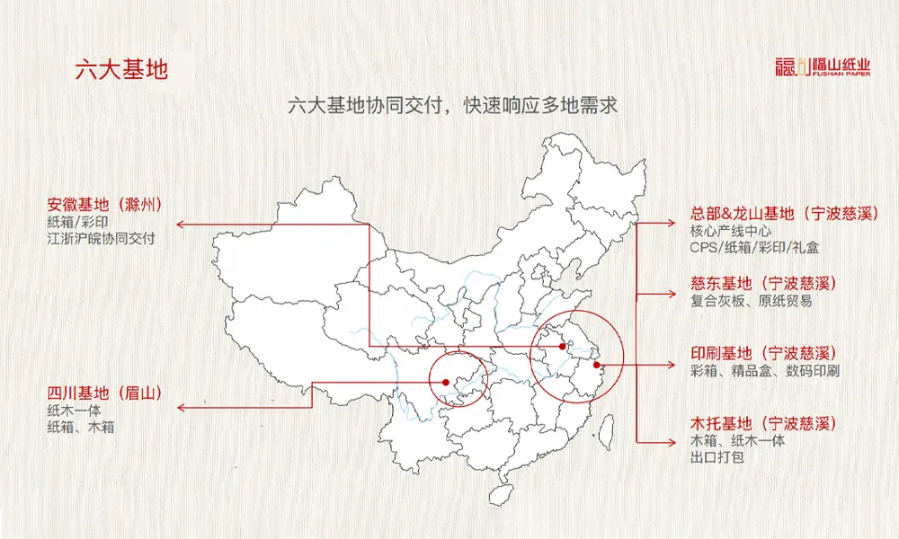 - 总部&龙山基地(宁波慈溪):核心产线中心,CPS/纸箱/彩印/礼盒